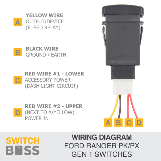 | Package Contents | 1 x Push Switch to suit Ford Ranger (Gen 1) 1 x Wiring Loom |