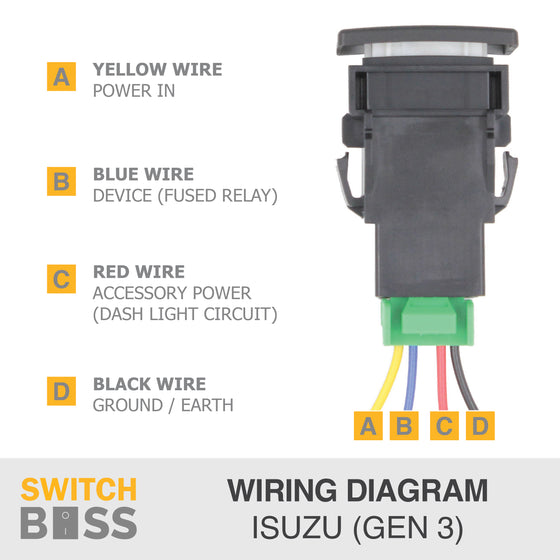 This Isuzu Gen 3 compatible push switch is designed to fit factory dash provisions in D-MAX (Sept 2020+) and MU-X (Aug 2021+), giving you a seamless way to control your 12V accessories. Featuring dual blue LEDs for both dash light and active illumination, it combines style with clear functionality. Supplied with a wiring harness for quick installation, it mounts firmly with no rattles and is built tough for long-lasting reliability. Perfect for powering lights, winches, or other upgrades in your 4x4, this switch delivers dependable performance with a professional finish backed by Switch Boss quality.