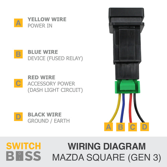 | Package Contents | 1 x Push Switch to suit Mazda Square (Gen 3) 1 x Wiring Loom + Plug |