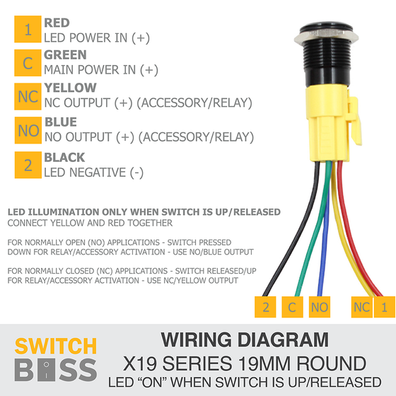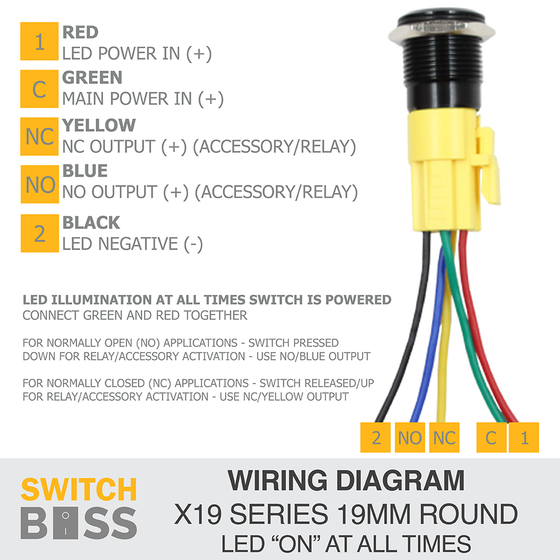 The X19 Series 19mm push button switch with centre LED offers a compact, durable, and stylish solution for reliable power control in 12V systems. Built with a black anodised aluminium body and polycarbonate button, it features a clear Blue, Green, or Red LED that shines through precision laser-etched symbols for a modern finish. Each switch has an On-Off latching function and supports both Normally Open (NO) and Normally Closed (NC) applications, giving you flexibility across setups. Pre-wired with a 5-pin connector for quick installation, this IP65-rated switch is ideal for automotive, boat, industrial, and DIY projects, delivering dependable performance backed by Switch Boss quality.