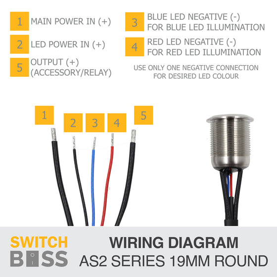 This 19mm stainless steel push switch with Blue or Red LED is a premium 12V solution built for durability and performance. Rated at 20A, it features a compact 316 stainless steel body with a natural finish, sealed resin-filled rear, and pre-wired 600mm 14AWG leads for quick installation. The tactile push action delivers smooth On-Off operation, with LED illumination selectable via wiring to either the Blue or Red negative connection. Perfect for boats, 4x4s, caravans, or industrial upgrades, this switch combines corrosion resistance, water-resistant IP67 protection, and a sleek low-profile design. Backed by Switch Boss quality, it’s a long-lasting choice for demanding applications.