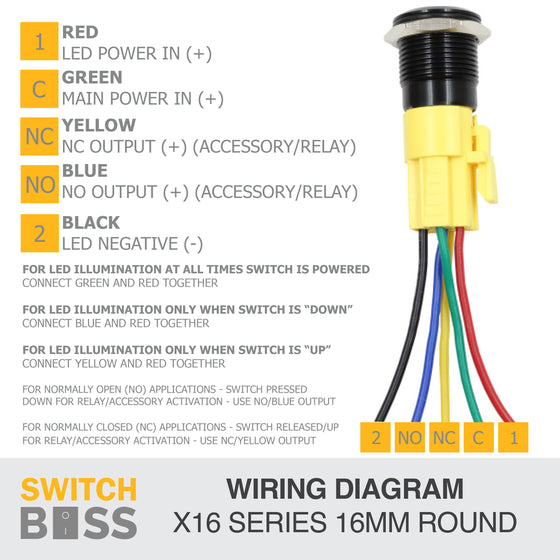 The X16 Series 16mm push button switch with centre thru-LED offers a compact, durable, and stylish solution for reliable power control in 12V systems. Built with a black anodised aluminium body and polycarbonate button, it features a clear Blue, Green, or Red LED that shines through precision laser-etched symbols for a modern finish. Each switch has an On-Off latching function and supports both Normally Open (NO) and Normally Closed (NC) applications, giving you flexibility across setups. Pre-wired with a 5-pin connector for quick installation, this IP65-rated switch is ideal for automotive, boat, industrial, and DIY projects, delivering dependable performance backed by Switch Boss quality.