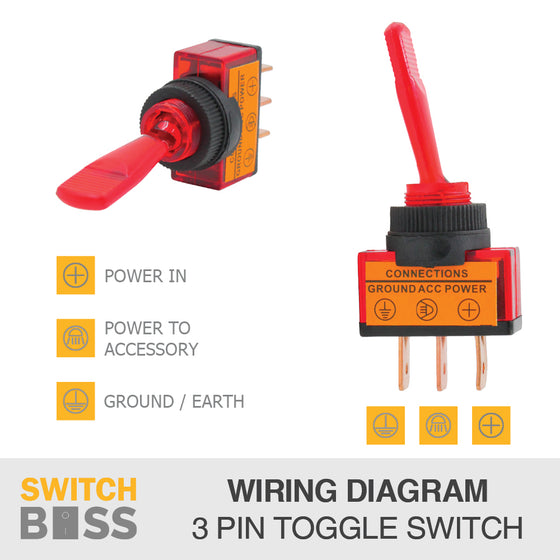 Illuminated toggle switch rated 10A at 12V. Built-in LED for easy on-off control in automotive and marine 12V setups.