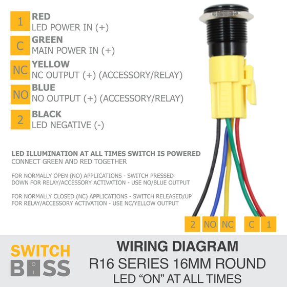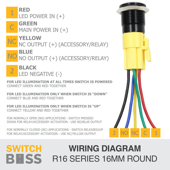 | Package Contents | 1 x R16-L Series Push Button Switch 1 x Pre-Wired 5 Pin Connector |