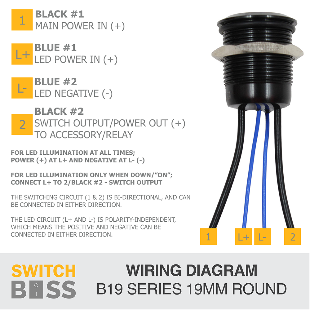 The B19 Series 19mm pre-wired momentary push button switch is a tough and reliable solution for controlling your 12V accessories. Featuring a black anodised aluminium body with IP68 protection and a resin-filled rear, it’s built to withstand dust, water, and harsh conditions. Available with either a blue or red LED ring, it provides clear visibility and multiple wiring options so the illumination can be set to suit your setup. With its simple momentary function, pre-wired leads, and secure panel mount fit, this switch is ideal for automotive, boat, or DIY applications where dependable performance is essential.