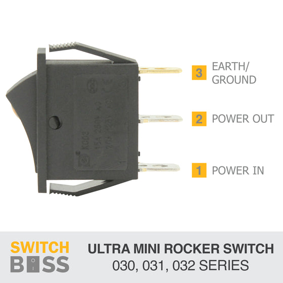 Compact 030 Series rocker switch. 13x30mm size perfect for space-limited 12V builds and switch upgrades.